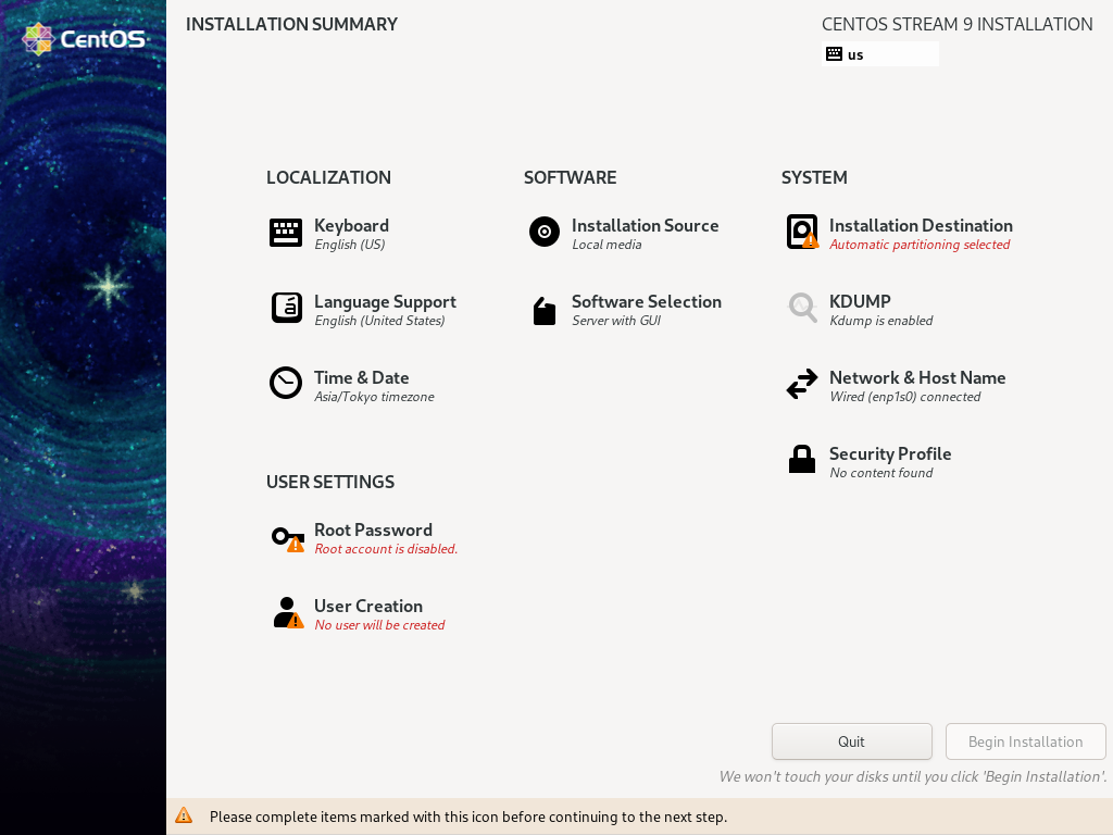 | [13] | انتخاب ها را تأیید کنید و اگر همه چیز درست بود، کلیک کنید [Begin Installation] برای نصب CentOS Stream |