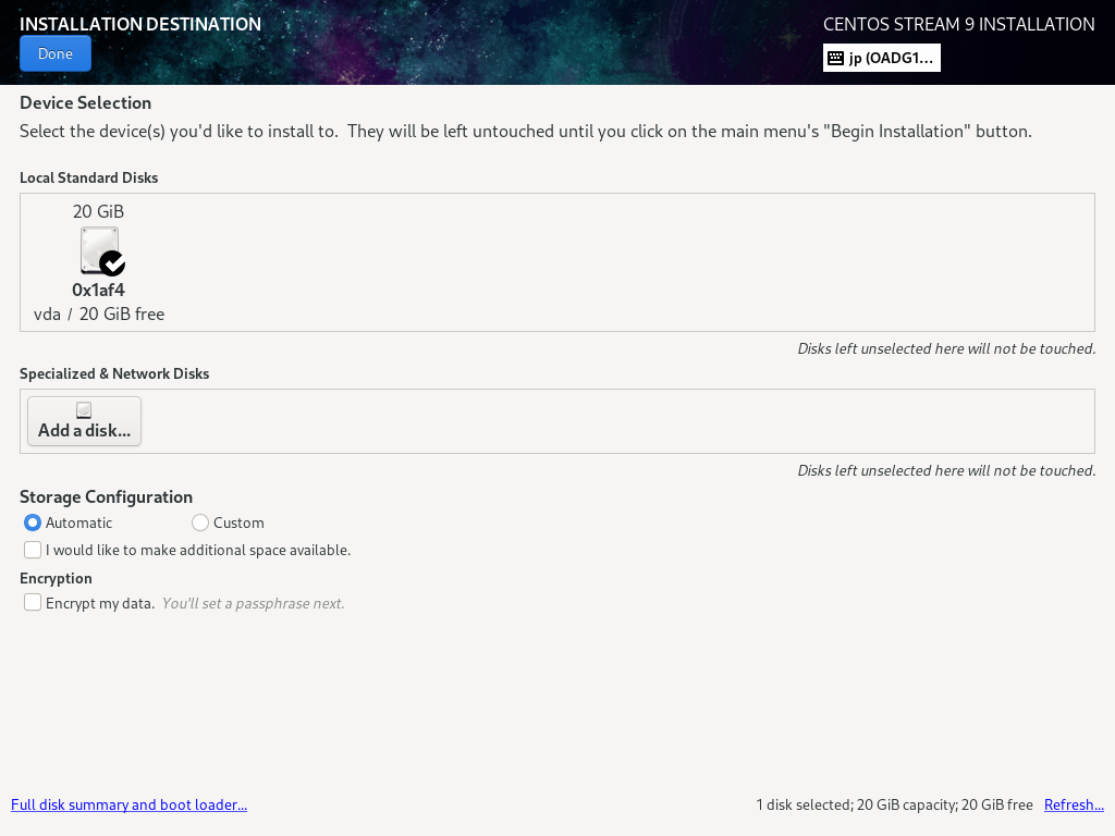 | [9] | بازگشت به بخش خلاصه نصب پیش فرض مانند [3]، بعد، کلیک کنید [Installation Destination] نماد برای انتخاب دیسکی که CentOS Stream را نصب میکنید. اگر چند دیسک به رایانه شما متصل است، باید دیسک مقصد نصب را انتخاب کنید. علاوه بر این، اگر میخواهید طرحبندیهای پارتیشن را به صورت دستی ویرایش کنید، انتخاب کنید [Custom] بر روی [Storage Configuration] بخش، یا اگر انتخاب کنید [Automatic] بر روی آن، پارتیشن بندی به صورت خودکار انجام می شود. سپس پارتیشن بندی به صورت پیکربندی می شود [/boot]، [/]، [/home]، [swap]. (اما اگر اندازه دیسک مقصد مانند زیر کوچک باشد، [/home] جدا نشده است). اگر همه چیز درست است، کلیک کنید [Done] دکمه ای که در سمت چپ بالا برای تکمیل پیکربندی دیسک قرار دارد. |